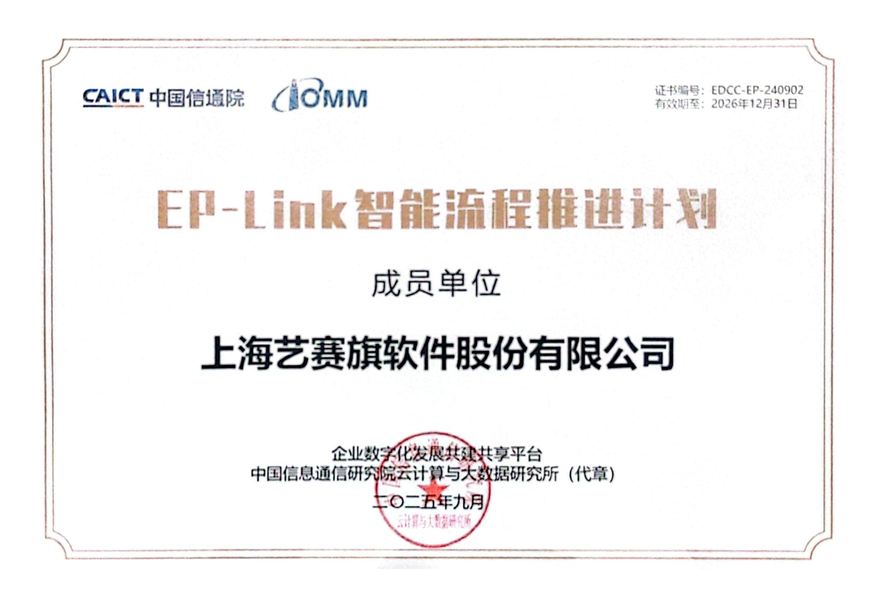 此次再度获颁信通院"EP-Link智能流程推进计划”成员单位证书,既是信权威机构对艺赛旗过往成绩的认可,更是对其未来发展的期许。
