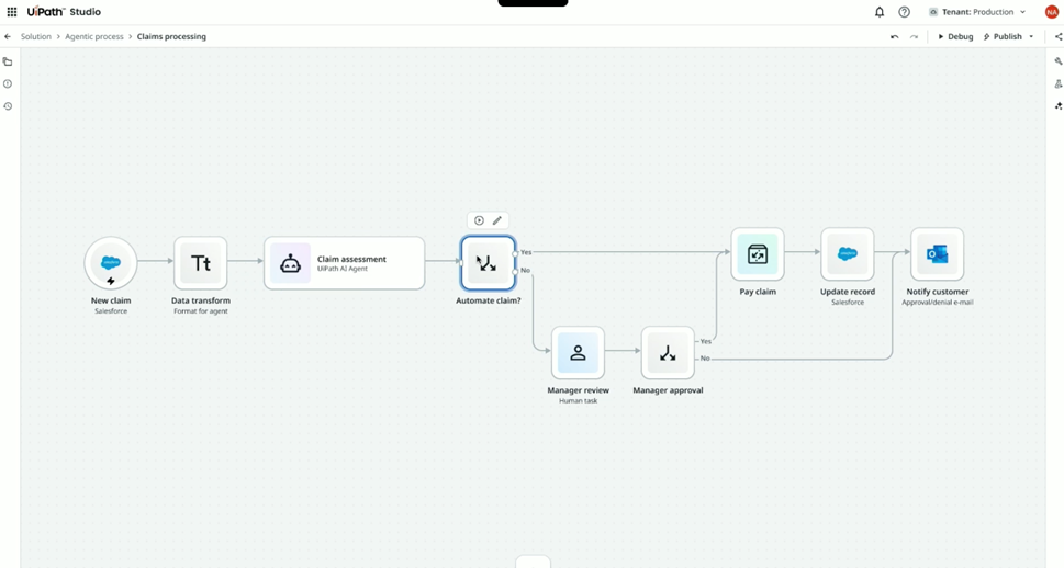 从UiPath的产品演进路径可以看到,“AI+自动化”从早期的单一技术发展,如今已经进入到了Agents、Robots、People共生协同的新阶段,工作流程不仅融入了机器智能,也更加突显了人的创造价值,实现数字生产力的倍增。