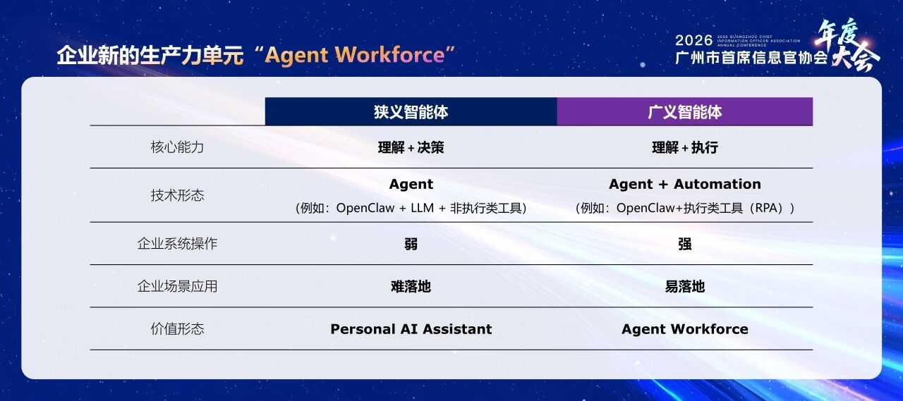 广义智能体:强调“理解+执行”,即Agent+执行类工具(如RPA),企业系统操作能力强,易于在复杂场景中落地,可形成可规模化的 “Agent Workforce”(智能体劳动力)。